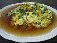 父さんが またまたいない晩ごはんは子供たちの大好きな にら玉あんかけと餃子、大根の酢漬け、中華風スープでラフに終了。