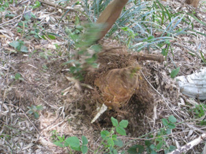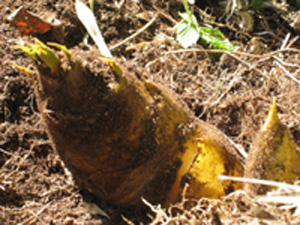 回りの土をよけて、穂先の向いている方向から根の向きを定めます。
