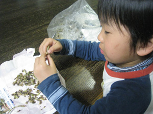 家に帰ってから、双子の一人は採って満足。そしてもう一人は、ばんご飯に作ってほしいとはかまをせっせと取っていました。どこで覚えたのかなぁ・・・