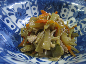 先日お料理教室で作ったうどのきんぴらに人参とお肉を豚肉に変えて作ってみました。もっとお惣菜らしくなって、豚肉もグーです。お試しを。