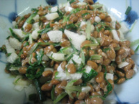 箸休めに、栄養的にも考えて、納豆、長芋、葱、水菜の塩茹でを混ぜます。トロトロは体にいいし、卵を混ぜて、ご飯にかけてもいいけれど、今日はポン酢でそのままに・・・こういうの大好きなのです。我が家では。