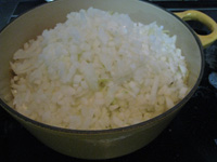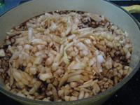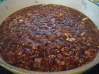 鍋に大量の新玉葱。ここに濃口醤油・みりん・赤ワイン好みで酢
