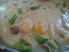 角切りの豚肉とプリプリのむき海老、きのこや玉葱、人参等の野菜を入れて、イエローペーストでしっかり炒めます。ここにブイヨンを入れてしばらく煮