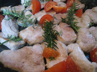 一緒にフレッシュのローズマリーを。両面焼けたら、トマトを散らし、蓋をして蒸し焼きに。不思議としっとり、肉は柔らかに、トマトは甘く。ビールのお供に夏はさっぱりと。。。レモンをジューッとかけても美味。