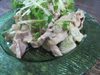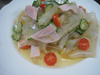 中華風味の和え物に。今日は、上海粉皮(ムングビーンシート)という、緑豆が原料の一見春雨のシート状のものを使って・・・。このシート、味はどちらかというと、春雨より、生春巻きの味。タイ風味。