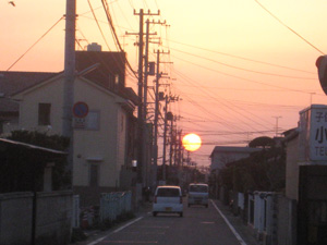 夕方、我が家の西の空にまん丸の夕日を見つけました。